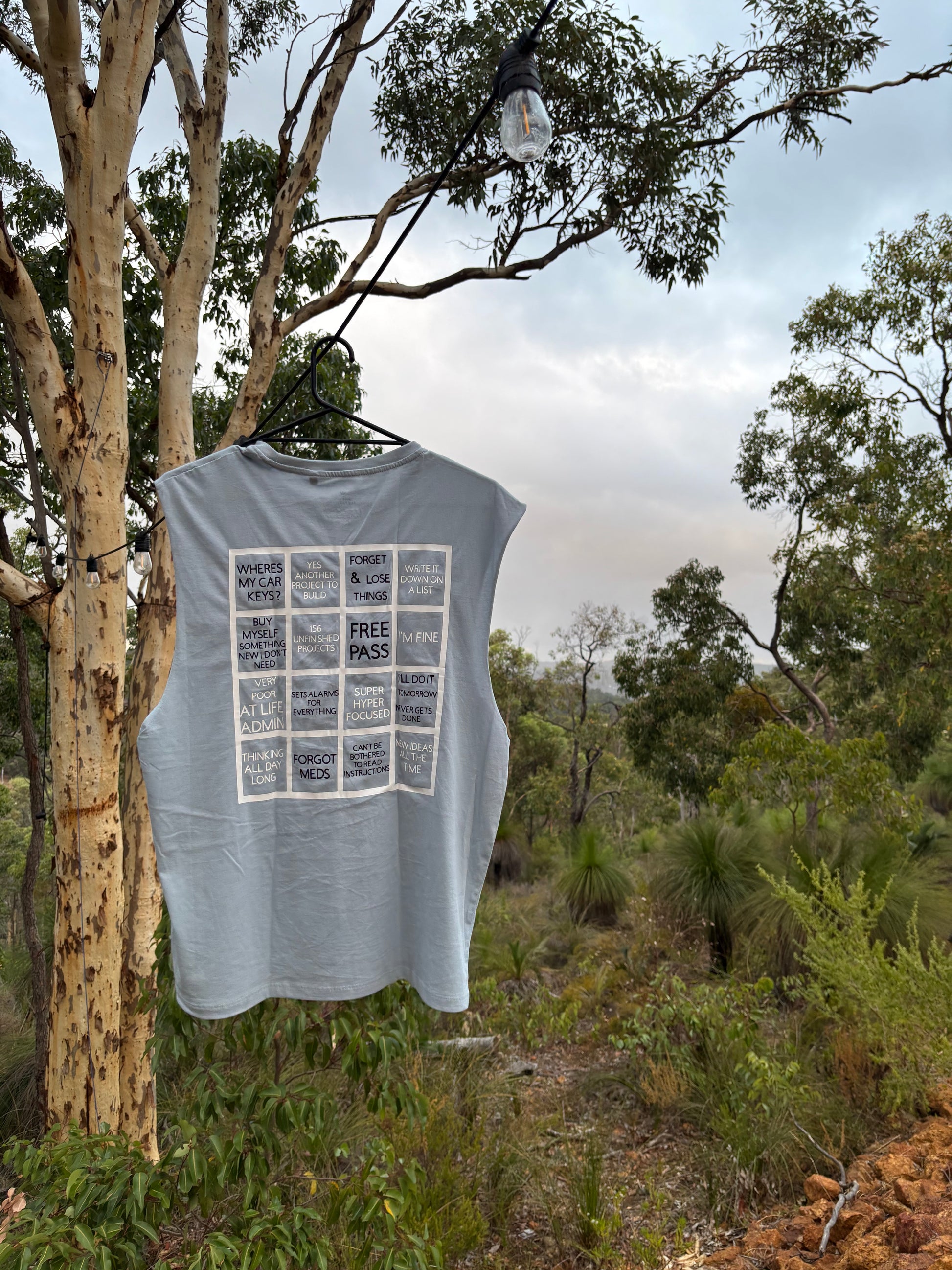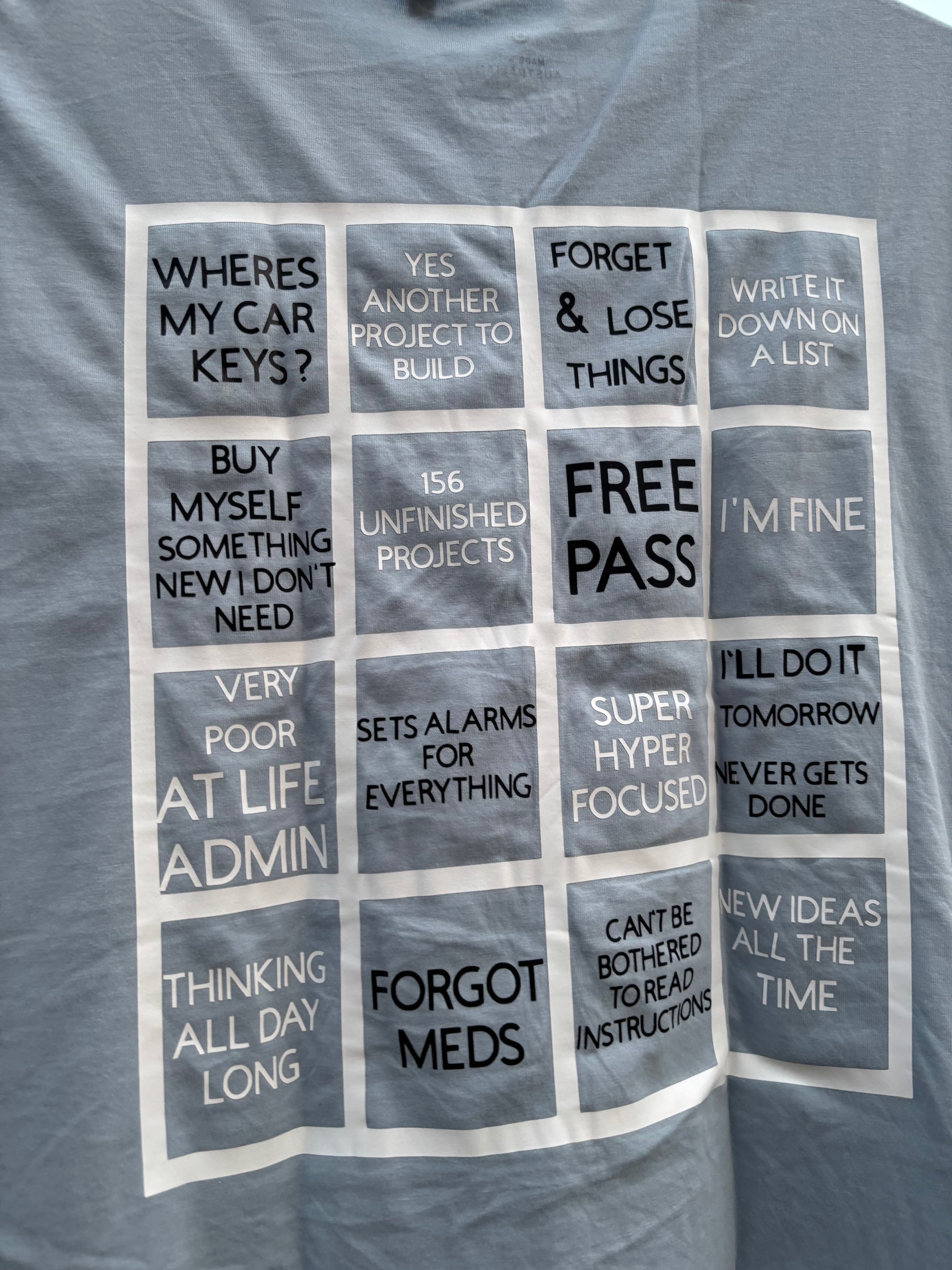 For people that have adhd like I do. This is a great shirt and it definitely really hits home to all of us💯😎. It’s the ADHD Bingo chart. These represent my good and bad habits. I can also print other catch word phrases to best suit your good/bad traits with this super power. Any colours and 5 different colour t shirts/singlets/jumper (light grey/light pink, white, black and light blue. S, M, L and XL in loose, relaxed, fitted and crop top
